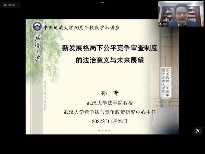 孙晋教授首先讲述了新发展格局与市场经济公平竞争,提出公平竞争法治理论是习近平法治思想的重要组成,聚焦于公平竞争审查制度的法治意义及其实现,认为经济法视域下公平竞争审查制度使得经济民主的实现成为可能,一方面公平竞争审查提供了用民主方式界定和表达公众利益的范式,另一方面可以公平竞争为衡量标准分析政府干预的合理性。除此之外,孙晋教授在讲座中深刻剖析公平竞争审查制度的实施现状,并对制度未来发展提出展望。