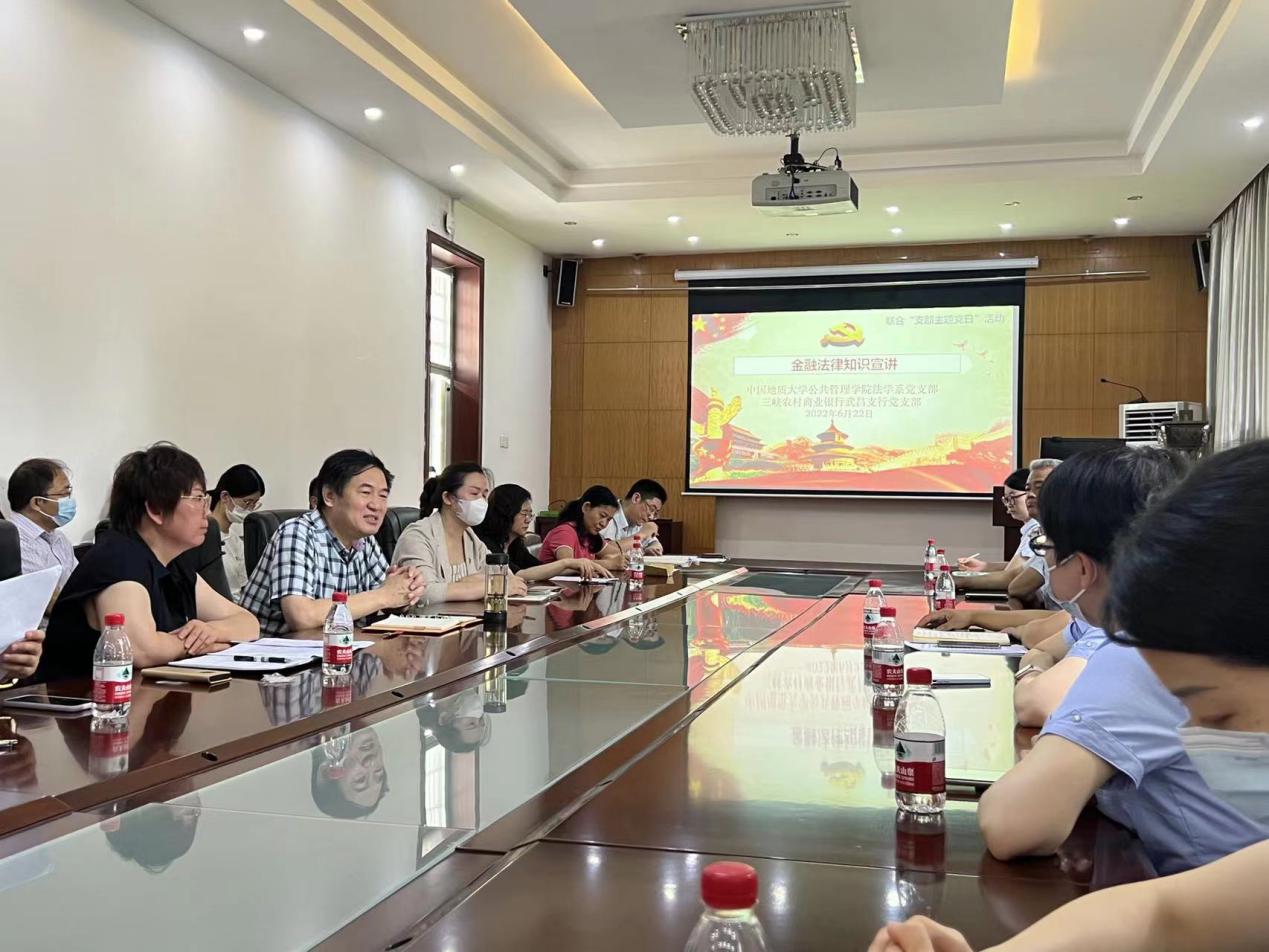 法学系党支部与三峡农商行武昌支行党支部推进党建共建活动。6月22日上午9点半,两支部联合开展的“金融安全风险防范”支部主题党日活动在北二楼B209会议室顺利举行。三峡农商行武昌支行行长胡超、副行长祝春、省农信联社反洗钱中心徐晓彬及三峡农商行武昌支行全体党员、学院党委书记张宽裕、副院长才惠莲、党委副书记龚丽、法学系全体党员及法学系学生代表参加了主题党日活动,法学系党支部书记徐明同志主持主题党日活动。
