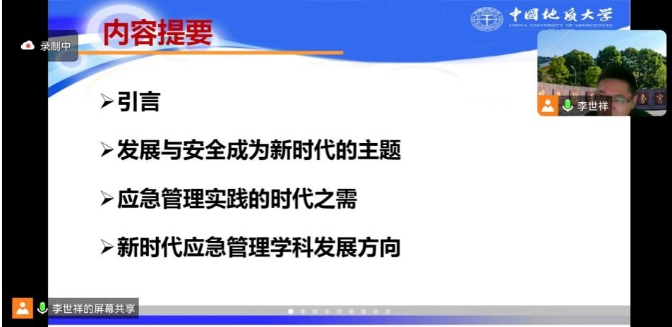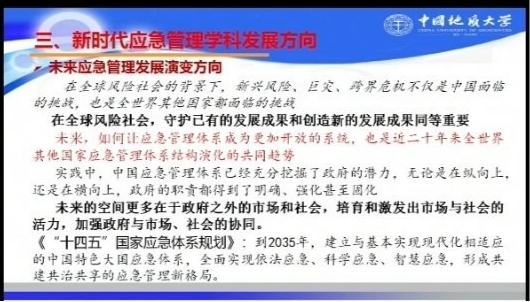 李世祥教授从党的“二十大”精神与应急管理、发展与安全成为新时代的主题、应急管理实践的时代之需以及新时代应急管理学科的发展方向等四个方面展开授课。