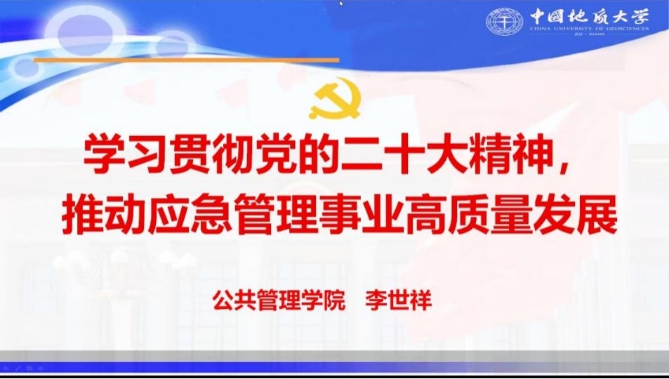 副院长、应急管理专业负责人李世祥教授以“学习贯彻党的二十大精神,推动应急管理事业高质量发展”为题讲授线上专题党课,应急管理专业师生等70余人参加了党课学习。
