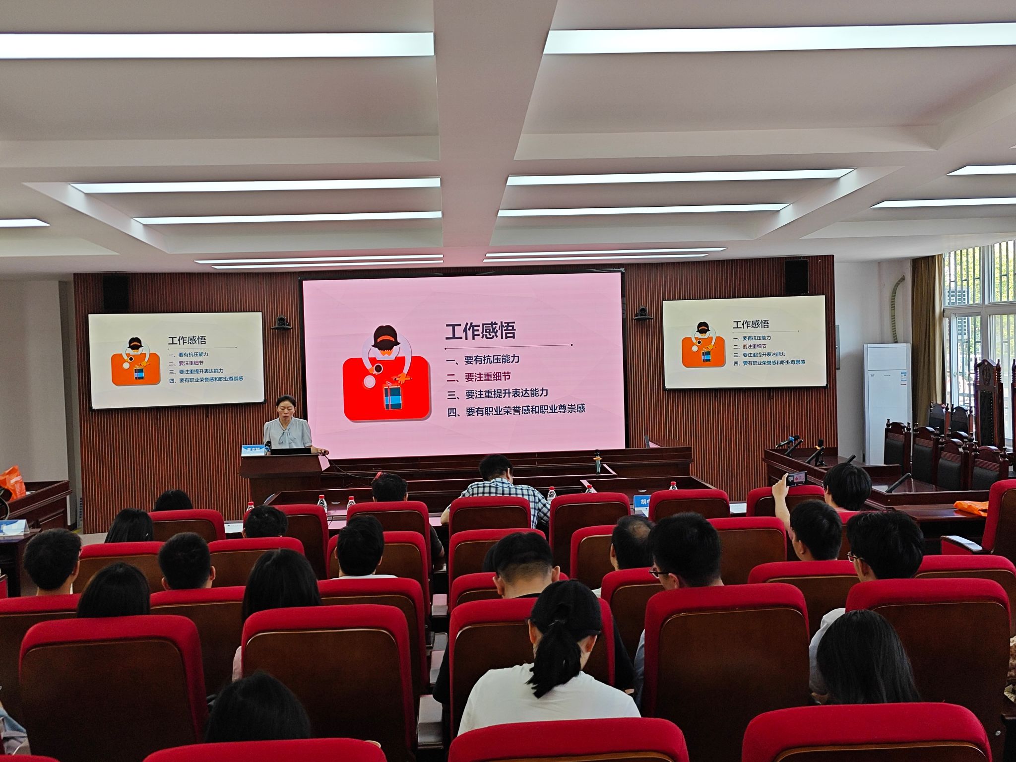 在交流环节,同学们从专业学习、生涯规划和成长建议等方面进行了提问,黄文娟校友一一给予了解答。“我觉得法官这份职业,很琐碎,很需要耐心。但是也很闪光,也很伟大!”,她勉励同学们要将工作岗位和个人兴趣爱好相结合,在工作中要有抗压能力,要注重细节,要注重提升表达能力,要有职业荣誉感和职业尊崇感,真正在工作中实现自己的人生价值和理想。