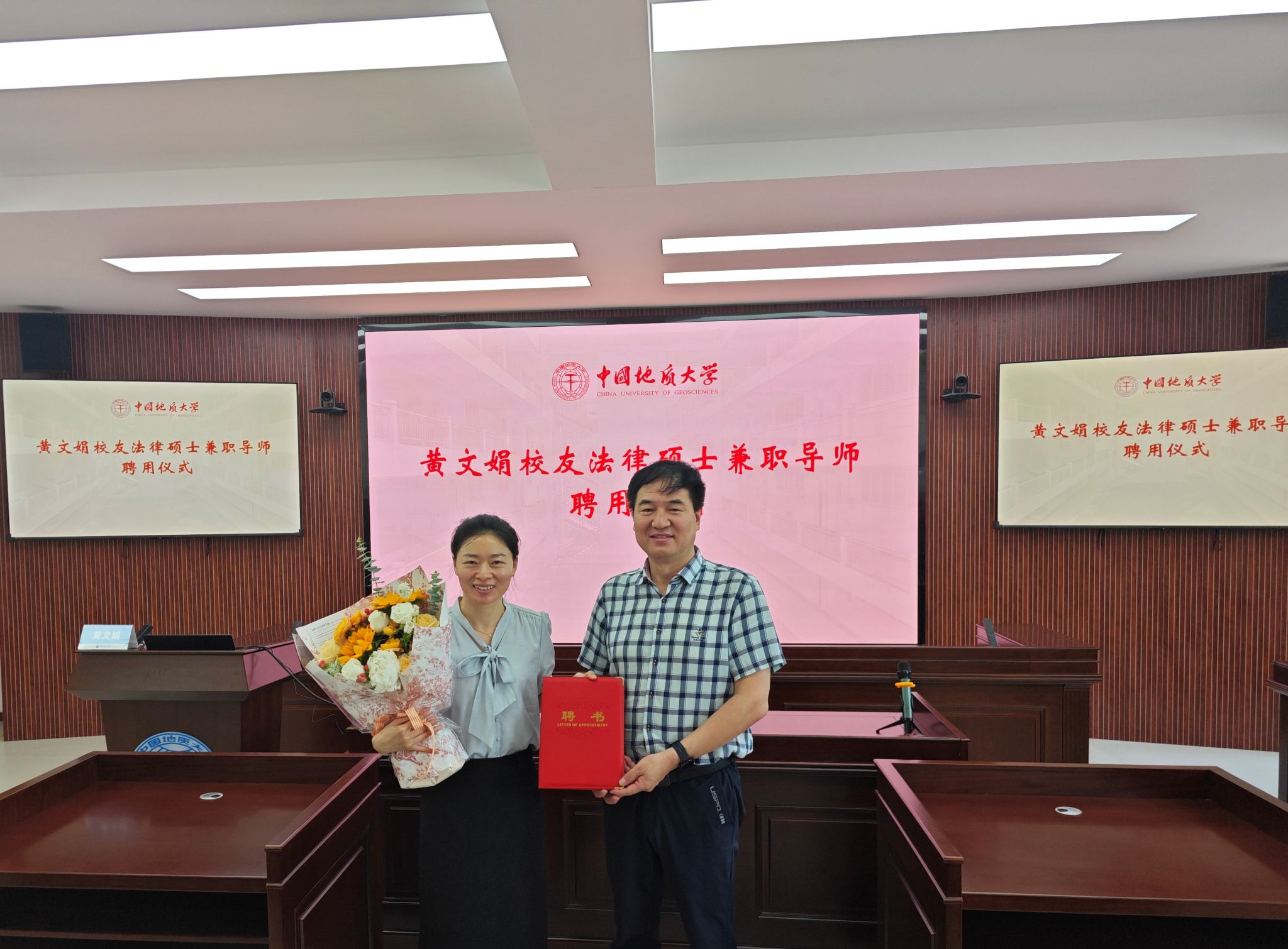 讲座开始前,学院党委书记张宽裕为黄文娟校友颁发法律硕士兼职导师聘书。