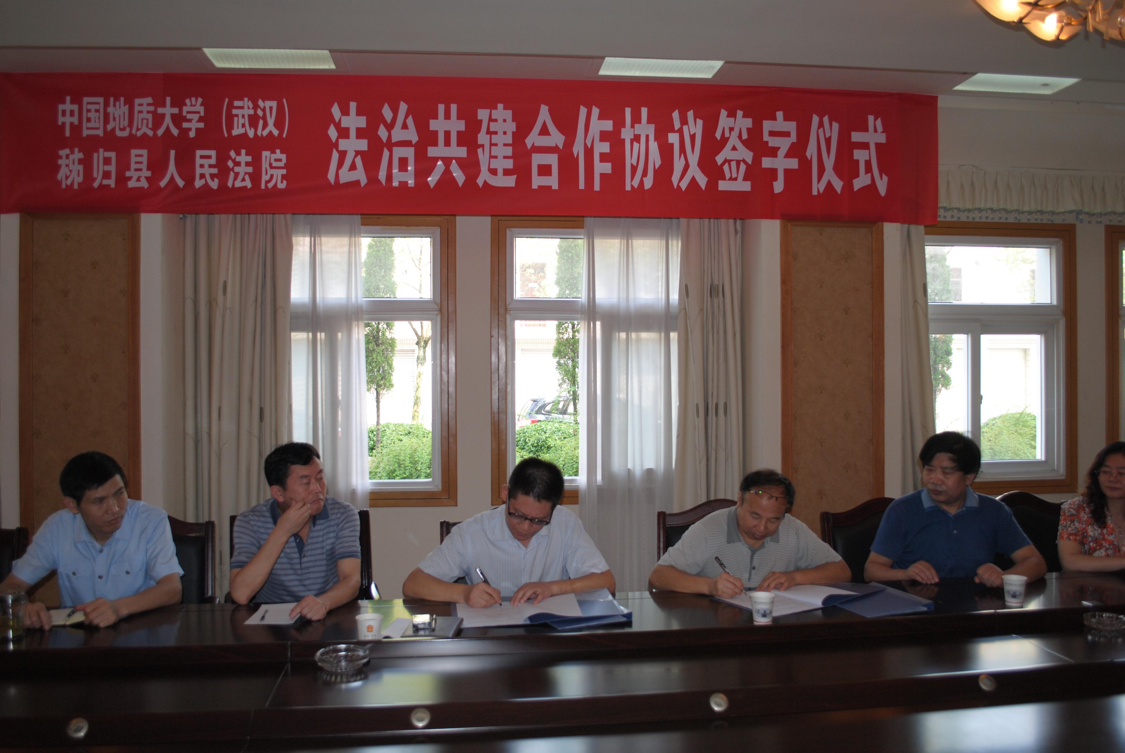 党总支书记张吉军、副院长王占歧、副院长才惠莲和法学系主任廖霞林、副主任刘琦一行来到湖北省秭归县人民法院,与秭归县法院院长胡永传、副院长胡永峰、副院长刘红、副院长彭少玲、纪检组长姜学龙、政治处主任周志元在秭归县人民法院三楼会议室进行了座谈,在涉及法治合作、人才培养和科学研究等方面的具体合作事项深入交换了意见,双方根据达成的共识,现场举行了 “法治共建合作协议”的签约仪式。
