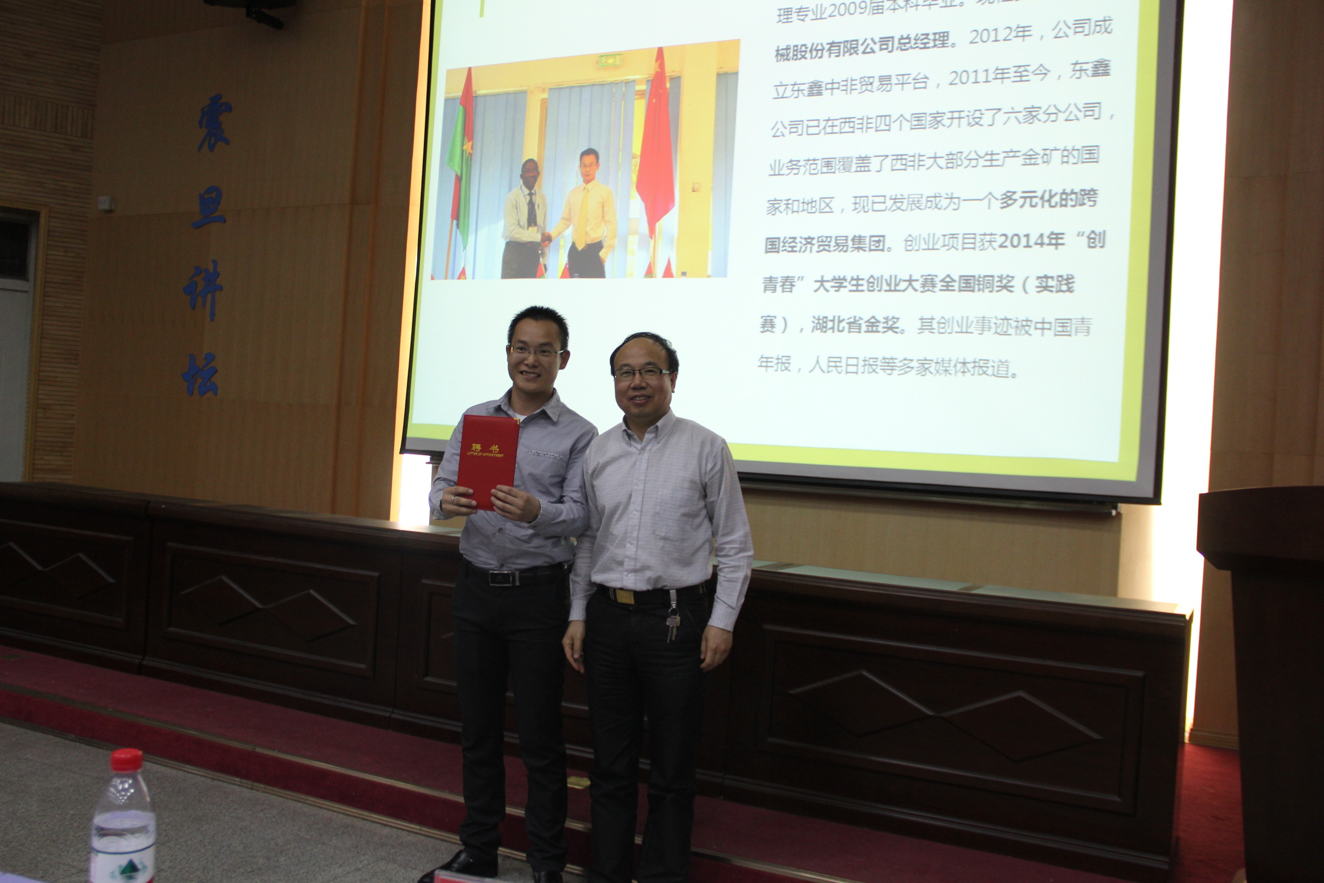 大学生创业导师”聘书。在全场师生热烈的掌声中,郭林校友以“我的大学与非洲创业之路”为主题进行演讲,分享了他的求学、求职和创业之路。