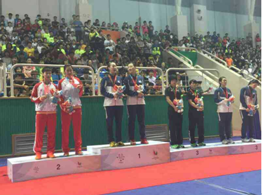 图1 区冬妮(左)与队友在女双亚军的领奖台上