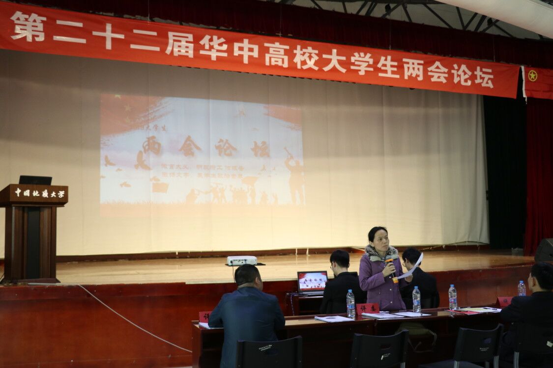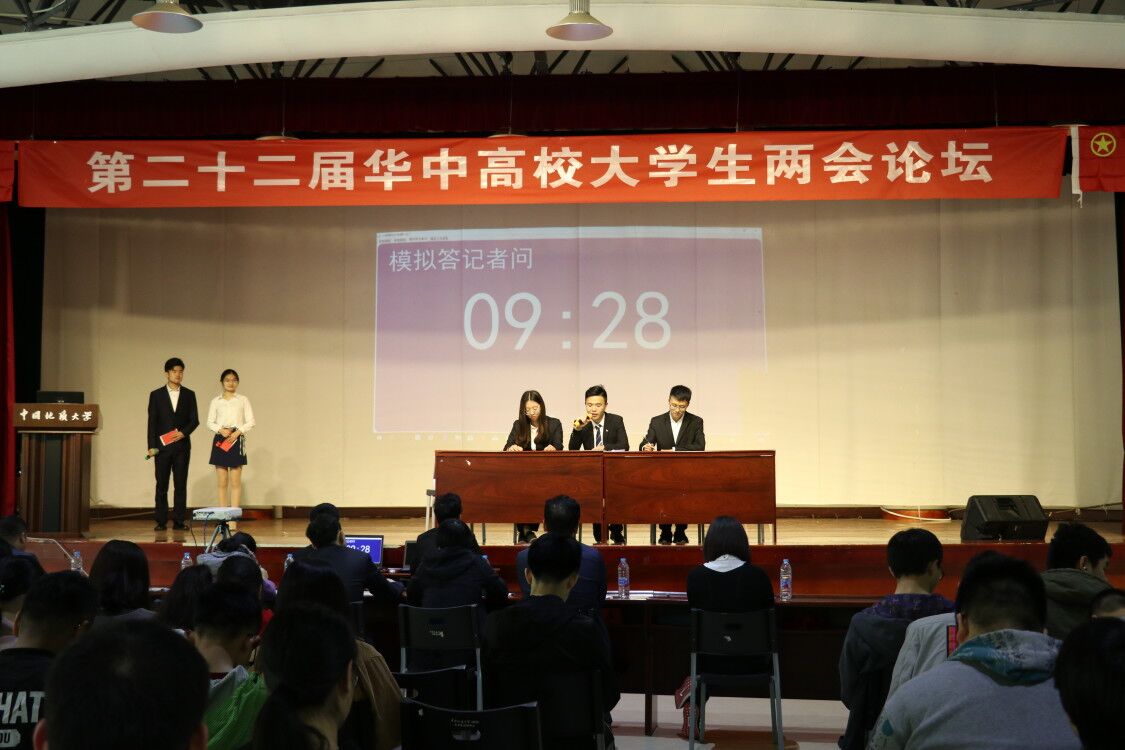 举办的“第二十二期华中高校大学生两会论坛”在大学生活动中心二楼演播厅举行。担任此次活动的评委老师有学工处副处长张建和老师、校团委副书记姜明敏老师、马克思主义学院李敏伦老师、五楼自拍