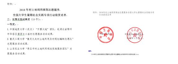 2019年5月30日,由中国土地学会、中国青年志愿者协会联合组织行业知名专家,结合成果完备程度、活动组织秩序、社会影响程度、成果应用价值、成果创新水平等因素,评选优秀实践团队12个(一等奖3个、二等奖4个、三等奖5个),优秀实践成果13个(一等奖3个、二等奖5个、三等奖5个)。五楼自拍