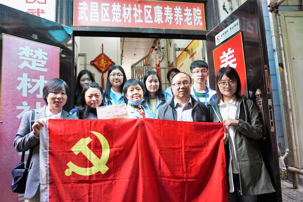 的老师和志愿者们在武昌区康寿敬老院开展了以“红色党情,暖色夕阳”为主题的敬老志愿活动。