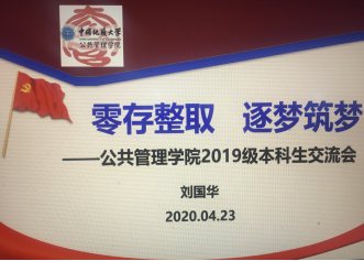 刘国华副书记以《零存整取逐梦筑梦》为题做总结发言。刘书记同样表达了对同学们的想念,和同学们一起深情回顾自去年9月份入学以来的军训、爱国主义教育、开学典礼、我班我秀暨学风建设表彰等系列活动,展示了当天所拍摄的校园图片,带领同学们置身于地大校园,领略地大的美。刘书记认为,以生为本、立德树人是教师的育人使命,每位同学必须在内心明确学习是大学生的主责主业,坚守学业为首的初心,在疫情防控期间继续抓实学风、自学自律、乐学善思,做到在家和在校一样,以实际行动不断增强自己的自我教育、自我管理、自我监督、自我服务意识,增强与学科、学术、个人可依托专项发展平台的融合度,做一名具备基本品德素养、一定能力结构和独特气质特征的公管学子。碎片化学习已成为网络学习的显著特征,当代大学生在校期间应将“零存整取”式学习作为应对碎片化挑战的具体策略,为更好实现自己大学梦想和顺利毕业奠定更加坚实的基础。最后,刘书记把《礼记·大学》中“知止而后有定,定而后能静,静而后能安,安而后能虑,虑而后能得”这一名言警句送给同学们,希望同学们逐步提高自己总体认知能力,在奋斗中国梦中逐梦公管、筑梦地大,实现个人梦想。
