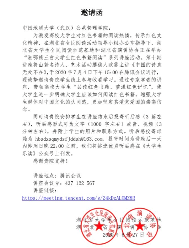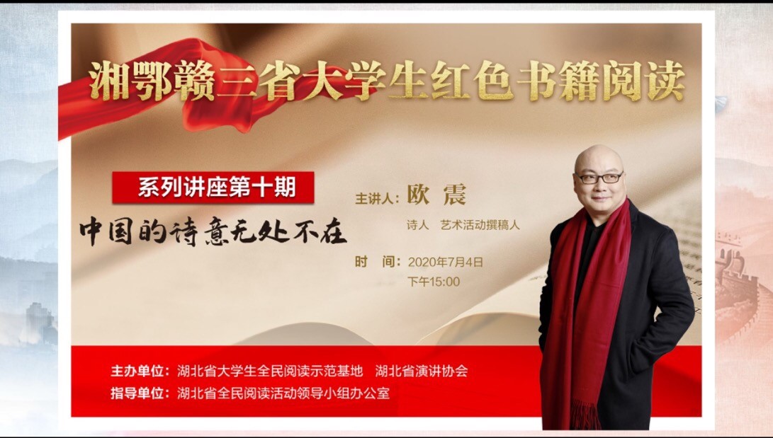 最后,同学们观看了由湘鄂赣三省大学生代表朗诵得欧震老师作品《青春中国》,并与欧震老师进行了积极的互动。欧震老师从诗歌的情感体悟,诗歌的朗诵技巧,红色书籍阅读的必要性与重要性三个方面,回答了同学们的问题。