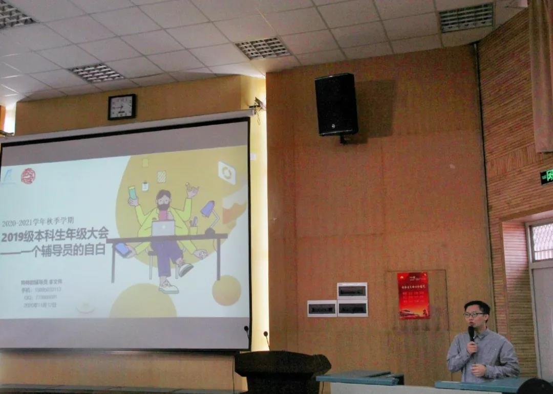 于2020年11月12日14:00在教三楼109室举行2019级、2020级年级大会暨考风考纪动员大会。学院党委副书记刘国华老师、2019级兼职辅导员李文伟老师、2020级辅导员王欣雨老师、兼职辅导员周佳仪老师及学院2019级、2020级全体本科生参与此次大会。