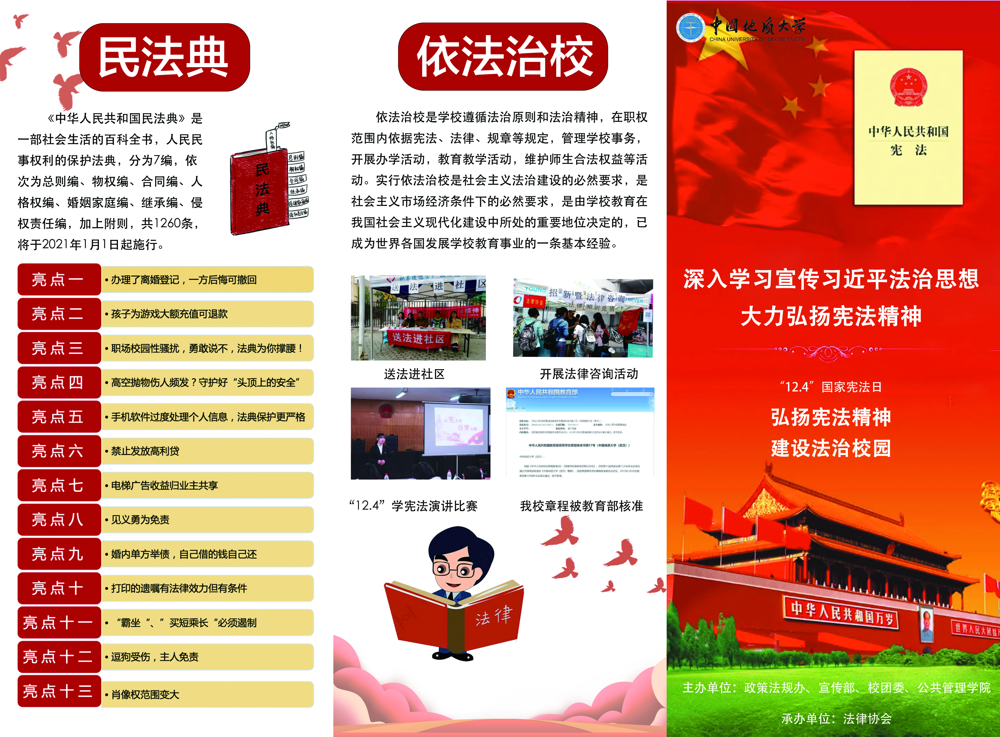 、校团委在东区综合楼AB一楼中庭共同布置了以“弘扬宪法精神,建设法治校园”为主题的4个主题24块宣传展板,展板共分为“习近平法治思想”“弘扬宪法精神,维护宪法权威”“学号用好民法典,做知法守法好公民”“依法治校”;制作500份普法宣传册面向师生发放,进一步增强了师生法治意识。