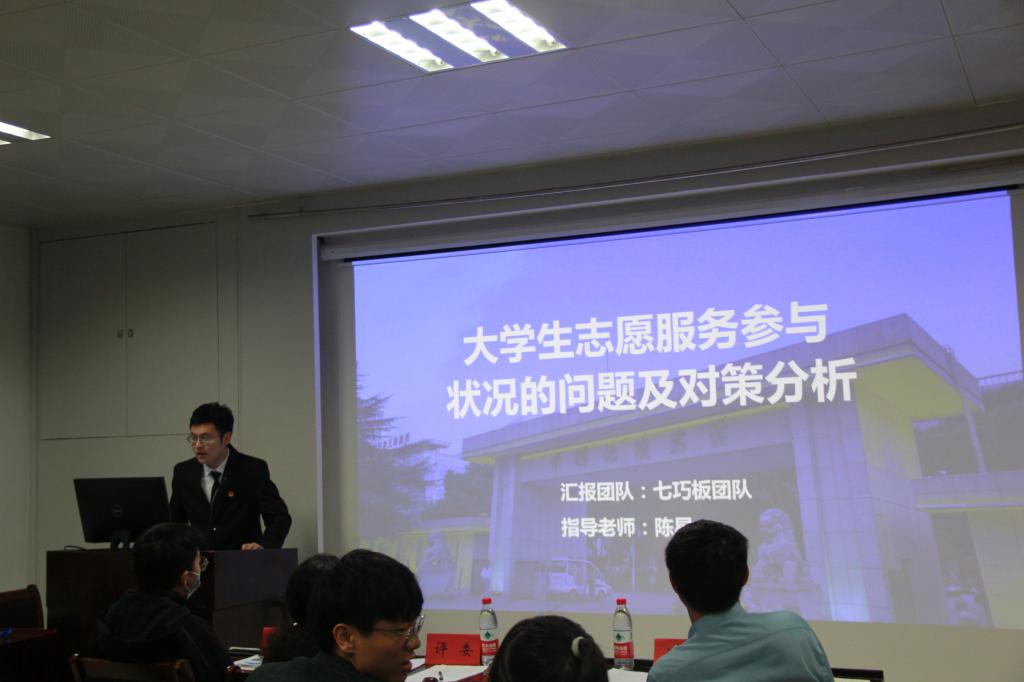 随后上场的是“七巧板队”,他们对大学生志愿服务参与状况的问题及对策进行了分析,得出对大学生志愿参与的积极性影响最大的是人际阻碍因素,并针对性地给出了他们的建议。在答辩中,小队成员针对评委老师提出问题,提出了“签保险保障志愿服务同学的安全”以及“创新发放志愿服务名额的方式”两个方案,得到了评委老师的肯定。