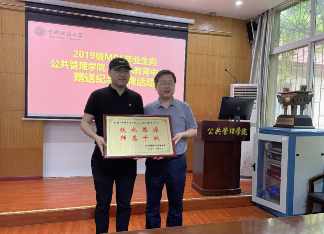 2019级MPA研究生代表范尧同学向MPA教育中心领导赠送了“饮水思源、师恩千秋”的牌匾。