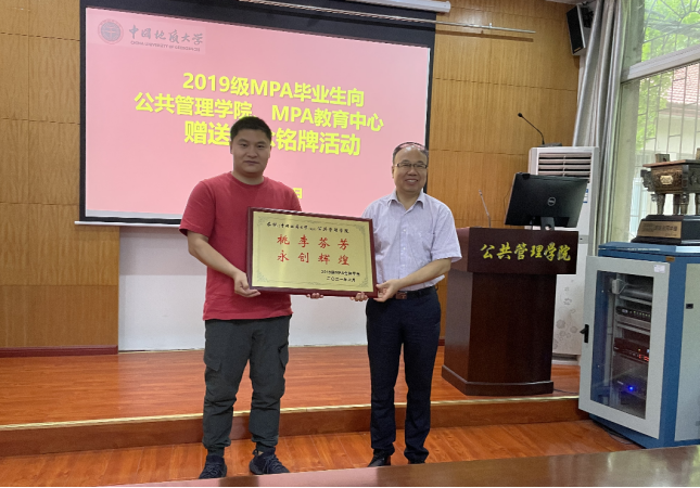 随后,2019级MPA毕业研究生代表郑思元同学向学院领导赠送了“桃李芬芳、永创辉煌”的牌匾。