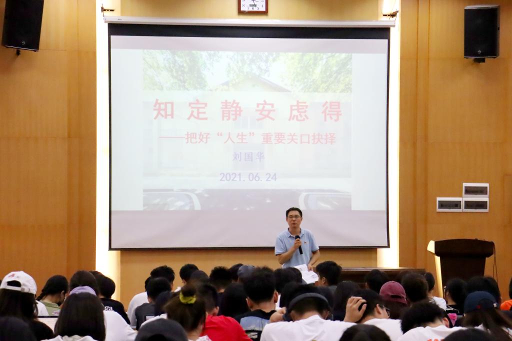 最后,刘国华副书记以《知 定 静 安 虑 得——把好“人生”重要关口抉择》为题作深入交流。他详细解读了学校今年开展2021年“社会调查”实践教学工作方案,强调了此次调查须在实践中坚持问题导向、调查研究、踏石留印并号召大家挤出时间学习《实践论》《矛盾论》。他讲到“非知之难,行之为难;非行之难,终之斯难”,希望同学们今后无论是想继续学习深造、就业都可依内心真实所想给自己一个交代。考研是打一场信息战、心理战、持久战,只有吃的进潜心学习的“苦头”,不放弃、不浮躁、不蛮干,始终保持恒心和定力,勇于和敢于倒逼自己,以一股韧劲无我奋进、拒绝躺平,才能播种属于自己真正的收获、才能拥有真正的自己、才能真正品悦丰收的“甜头”。
