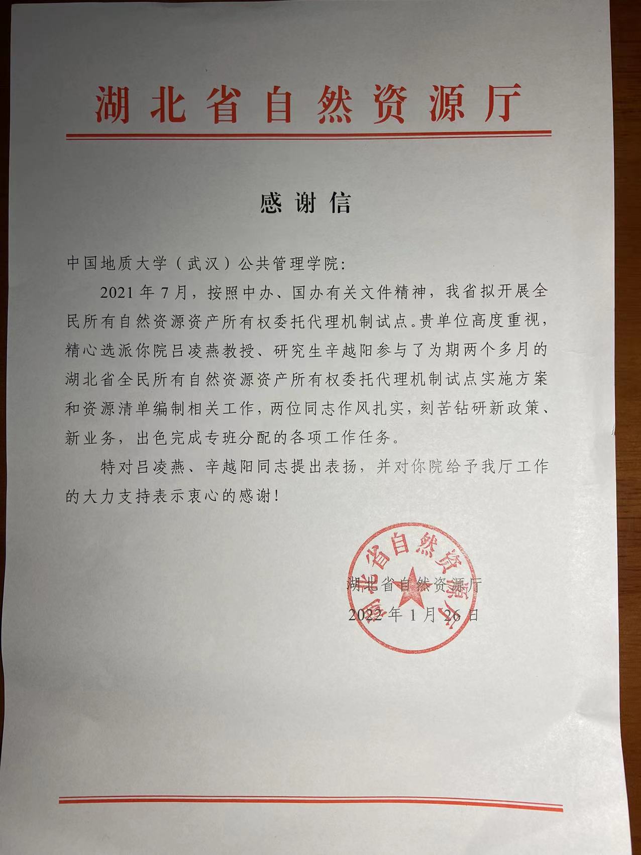 收到湖北省自然资源厅发来感谢信,感谢五楼自拍