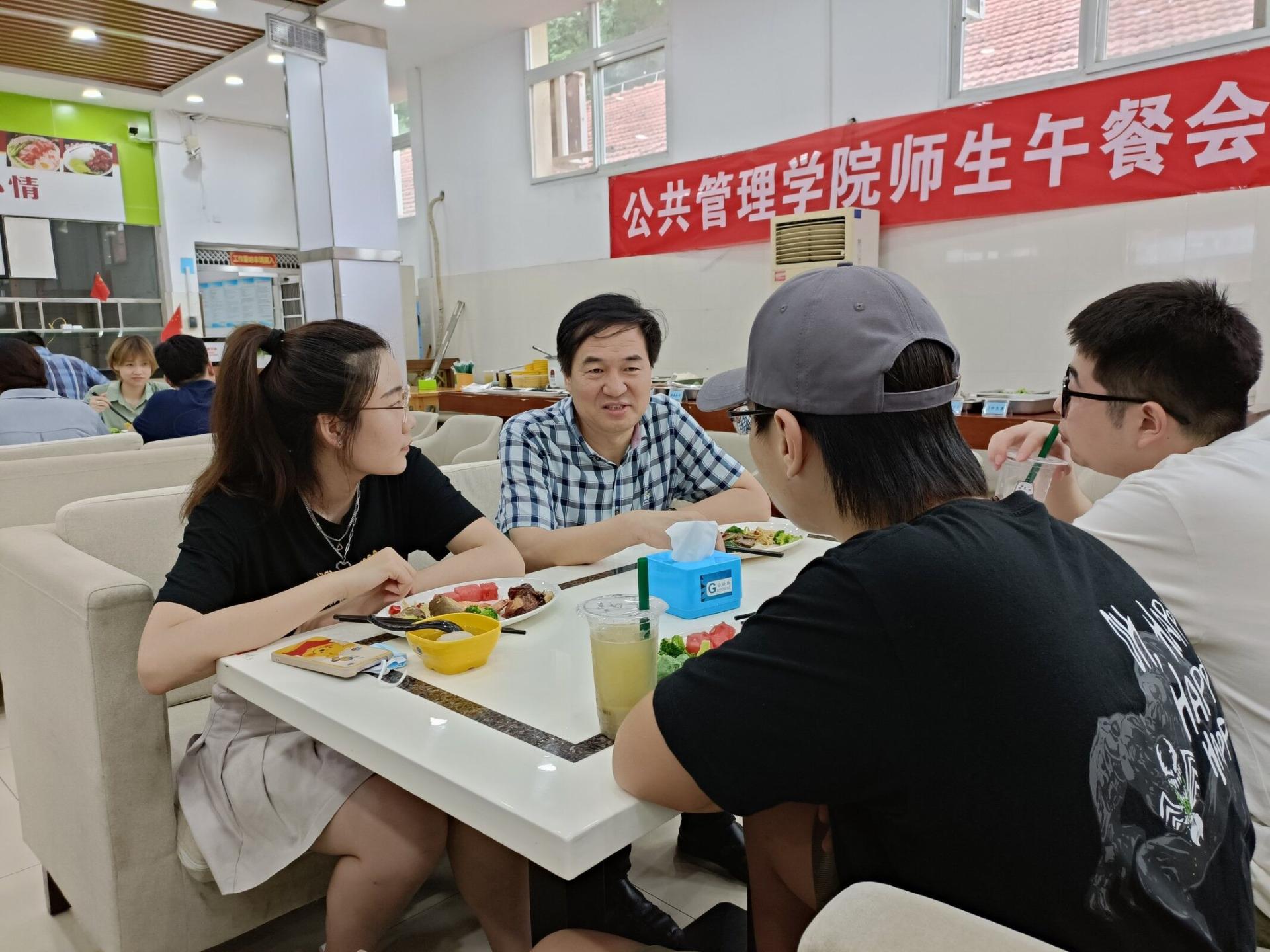 师生午餐会。学院党委书记张宽裕,院长胡守庚,副院长龚健、王忠、朱江洪,党委副书记龚丽,土地资源管理系方世明、周学武,法学系胡中华,学院综合办公室彭珂、李继杰等老师,学工组全体辅导员及各系本、硕、博学生代表参加本次午餐会。午餐会饭菜由北区饮食服务中心提供。