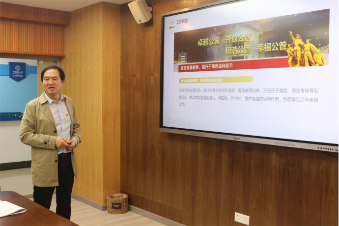 院长胡守庚重点汇报学院师资队伍建设、学科发展、科研平台建设等情况,并就公共管理学科跨越式发展计划向唐书记进行汇报。