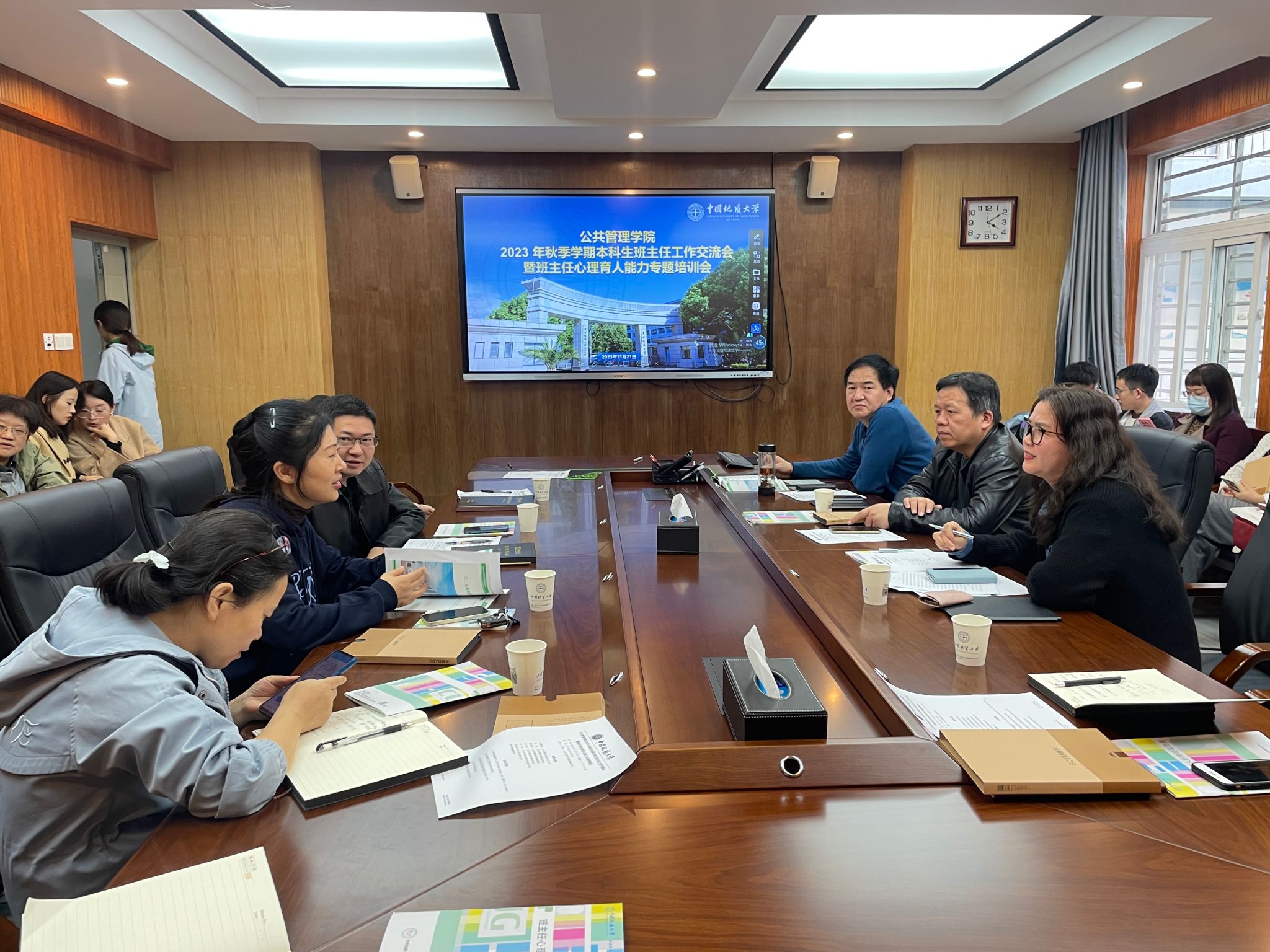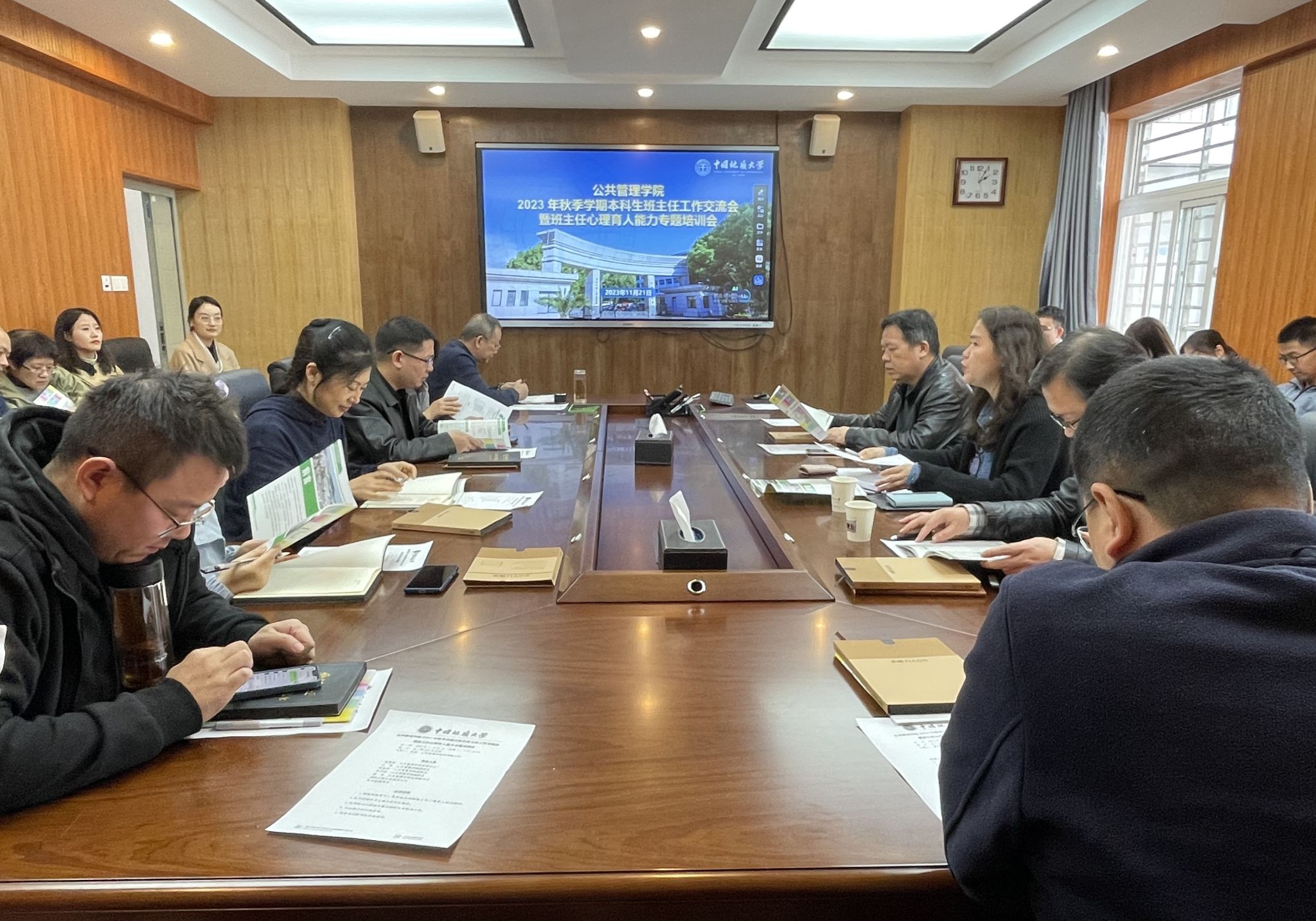 在北一楼227会议室召开2023年秋季学期本科生班主任工作交流会暨班主任心理育人能力专题培训会。学院党委书记张宽裕,副书记龚丽,副院长王忠、李世祥、朱江洪,全体班主任、辅导员参会。会议由龚丽主持。