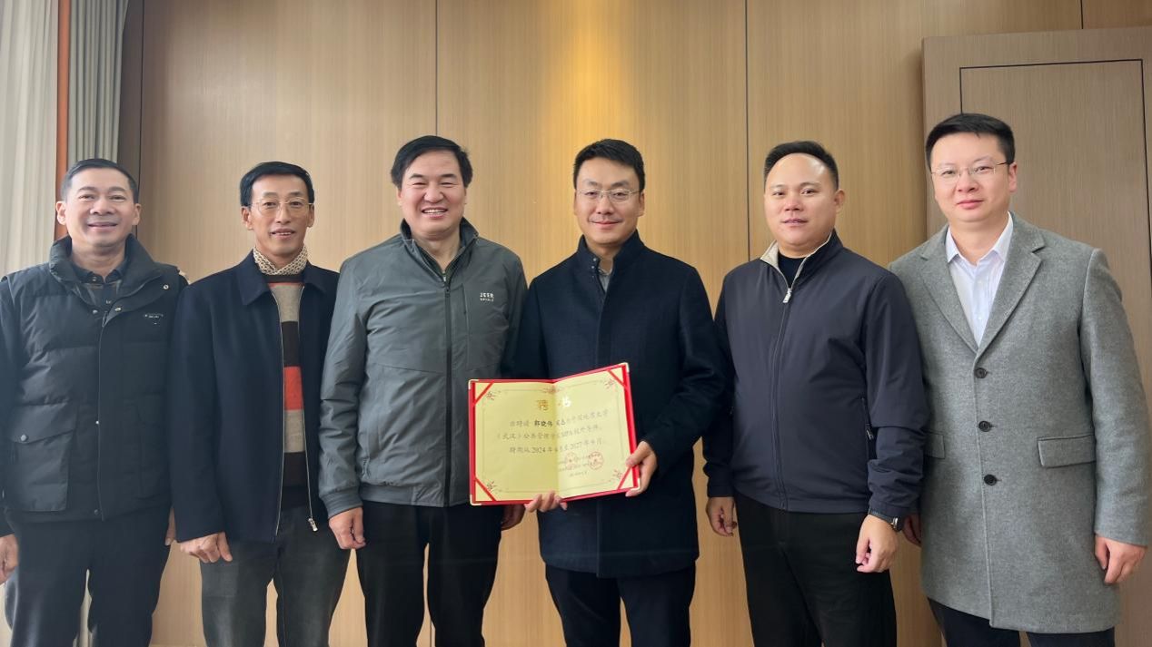 (武汉)MPA教育中心聘任江夏区商务局副局长郭晓伟为校外导师。学院党委书记张宽裕,教授田家华,江夏区副区长张立峰,五楼自拍