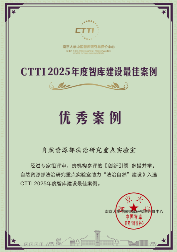 自然资源部法治研究重点实验室入选“智库建设最佳案例优秀案例”,并荣获“智库研究优秀成果奖”二等奖1项。据悉,本次大会发布的年度智库建设最佳案例,共收到367份建设案例申请,最终207项案例入围智库建设最佳案例推介名单,其中优秀案例103项;年度智库优秀成果共收到1014份智库成果申请,共591项成果入围智库优秀成果推进名单,其中一等奖173项,二等奖327项。