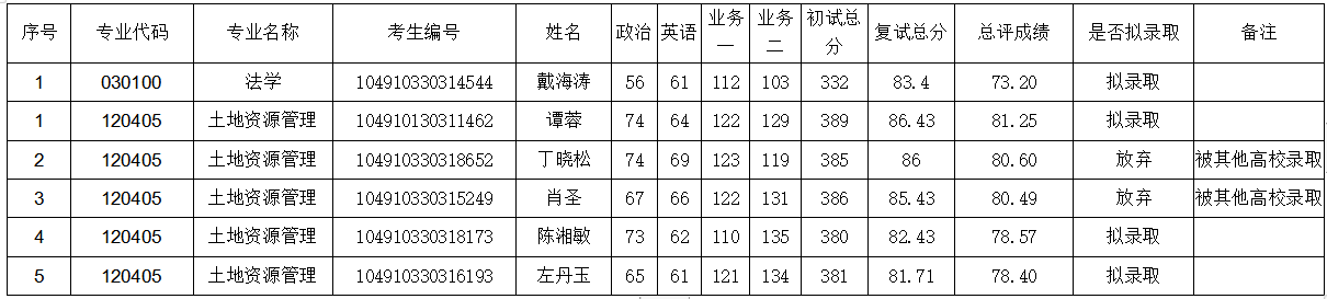 考虑五楼自拍 学科发展需求,经学院申请,研究生院同意,给予五楼自拍 法学专业增加一个指标,土地资源管理专业增加3个指标。现将补录结果公示如下(顺位录取。如有放弃,顺次录取):