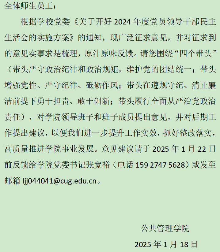 关于征求2024年度学院领导班子民主生活会意见建议的公告