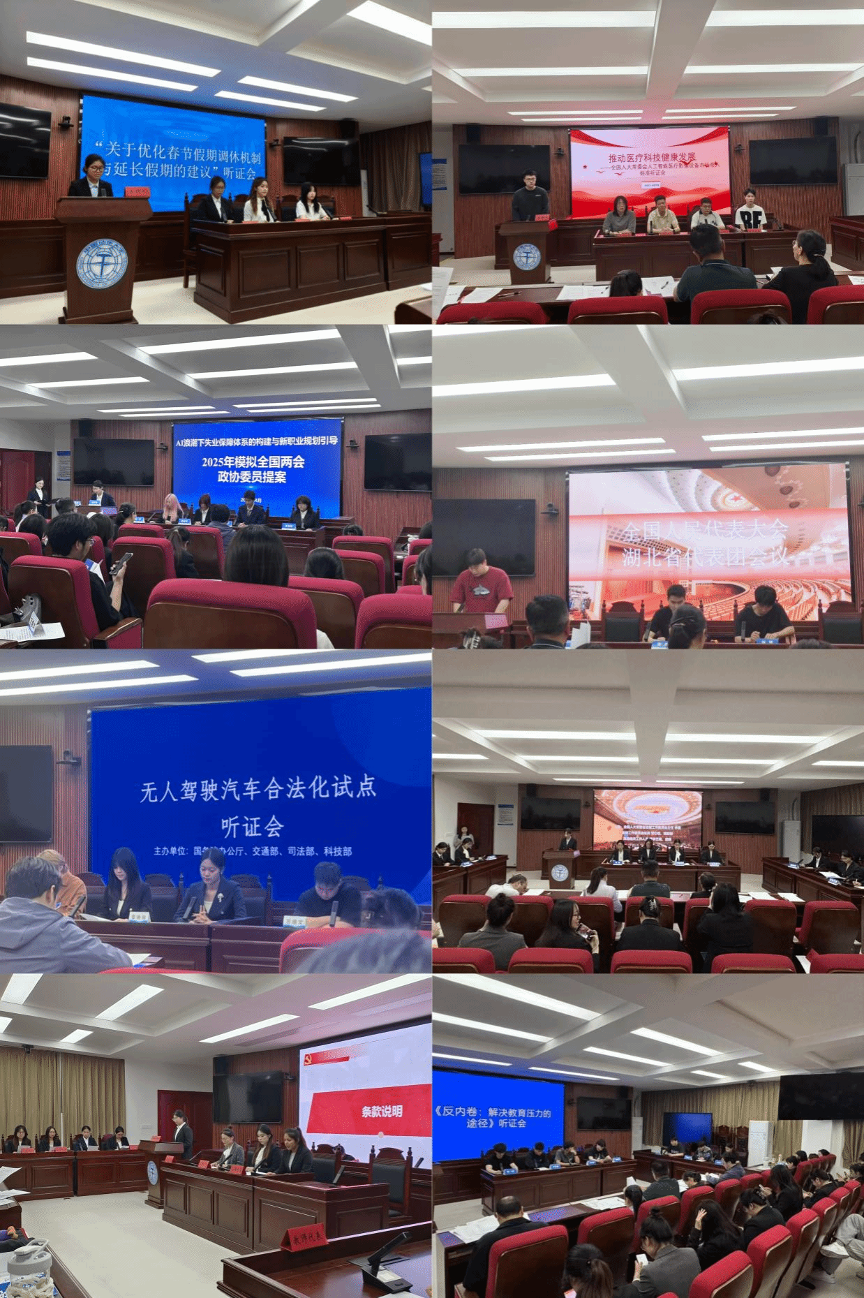 8个小组按照听证流程和全国两会审议议案流程,依次模拟展示听证事项和两会议案讨论的过程,聚焦“优化春节假期调休机制与延长假期”“是否应强制要求人工智能医疗影像诊断设备通过国家级临床安全认证后方可投入市场?”“AI浪潮下失业保障体系的构建与新职业规划引导”“审议关于推进银发经济高质量发展的报告”“无人驾驶汽车合法化试点”“中华人民共和国全国人民代表大会和地方各级人民代表大会代表法的提出、审议及通过流程”“关于降低未成年人刑事责任年龄的议案”“反内卷”等问题进行模拟讨论。