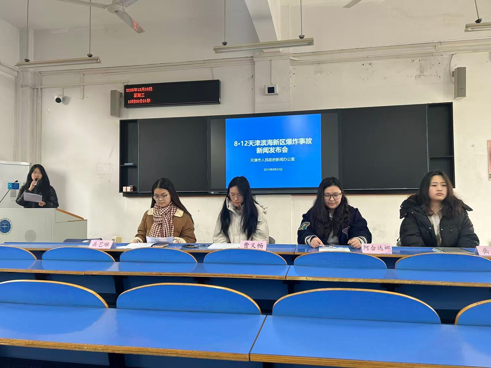 为让学生深刻体悟应急信息管理在突发事件处置中的核心作用,课程主讲苏黎兰老师创新性地引入模拟新闻发布会实训教学模式,将抽象的理论知识转化为具象的实战场景。同学们历经 “理论筑基 — 小组研讨 — 全流程筹备 — 实景演练 — 精准点评” 的完整教学环节:前期通过专题授课夯实应急信息管理知识框架,明确新闻发布会在应急处置中的关键定位;筹备阶段以小组为单位,通过头脑风暴设定突发事件主题,分工扮演新闻发言人、主持人、媒体记者等角色,发言人团队深入研判事件背景、打磨权威发布口径、预判敏感问题,记者团队精心策划采访角度、准备尖锐提问,在分工协作中锤炼信息搜集、分析研判、策略谋划与团队协作能力;实景演练环节,各小组轮流登台开展模拟发布,发言人从容通报情况、沉着回应追问,记者犀利发问、精准聚焦,高度仿真的场景还原了突发事件信息发布的紧张氛围;苏黎兰老师在每个环节后即时点评,从专业内容、表达逻辑、形体语言到应急应变策略给予精准指导,让同学们在实战打磨中查漏补缺。