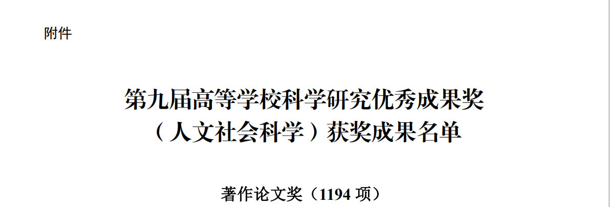 据悉,教育部高等学校科学研究优秀成果奖(人文社会科学)是国内人文社会科学研究领域的最高奖项。该奖项设立于1995年,每三年评选一次。本届评奖符合申报要求的成果共有7783项,最终评选出奖励成果1491项。