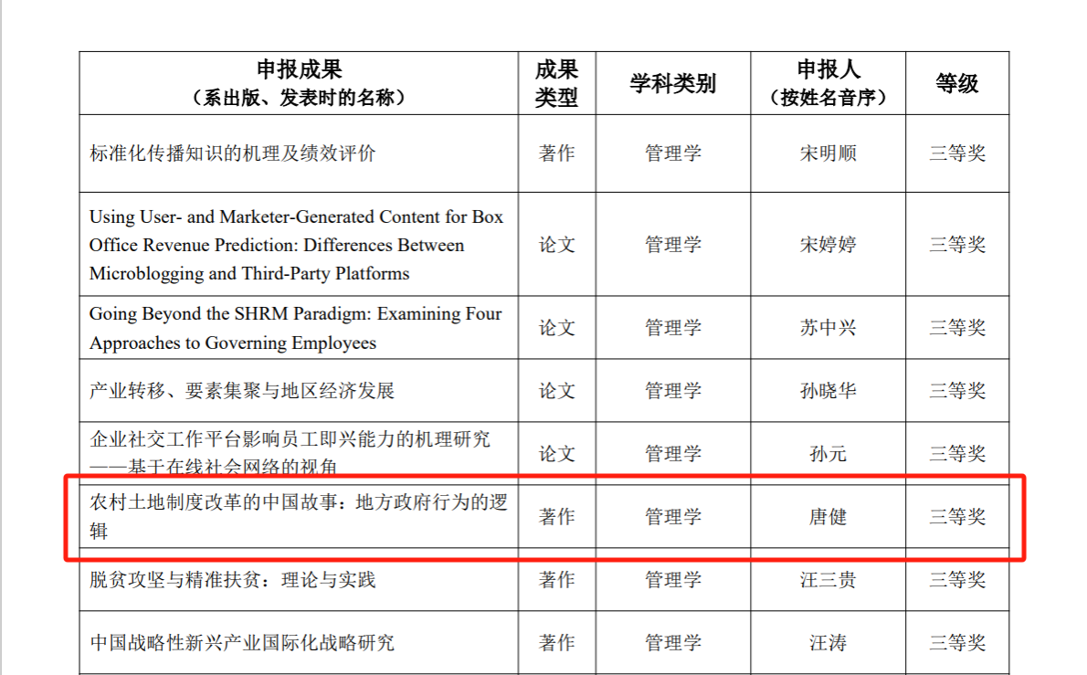 唐健教授的著作《农村土地制度改革的中国故事:地方政府行为的逻辑》荣获著作论文奖三等奖,共同作者还有浙江大学的谭荣教授和中国国土勘测规划院的魏西云研究员。